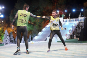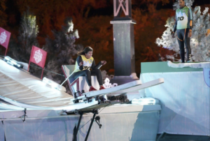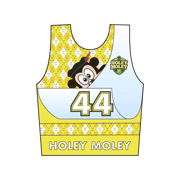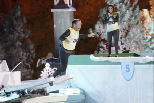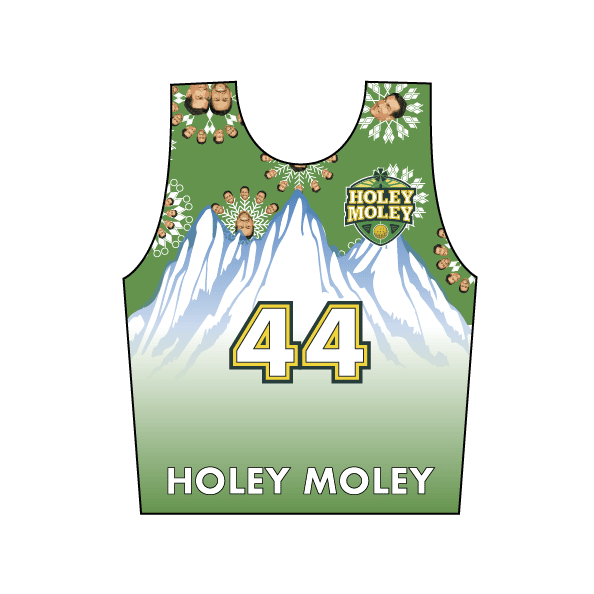 Design a pair of branded Winter Olympics style ski bibs for use on The Agony of Defeat hole on Holey Moley. Provide 4 pairs to select from.