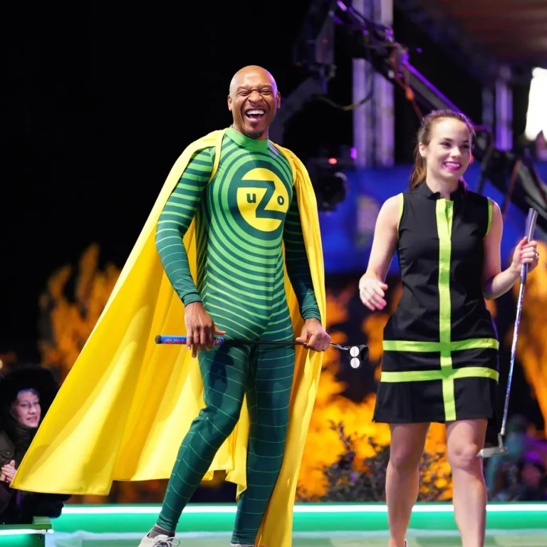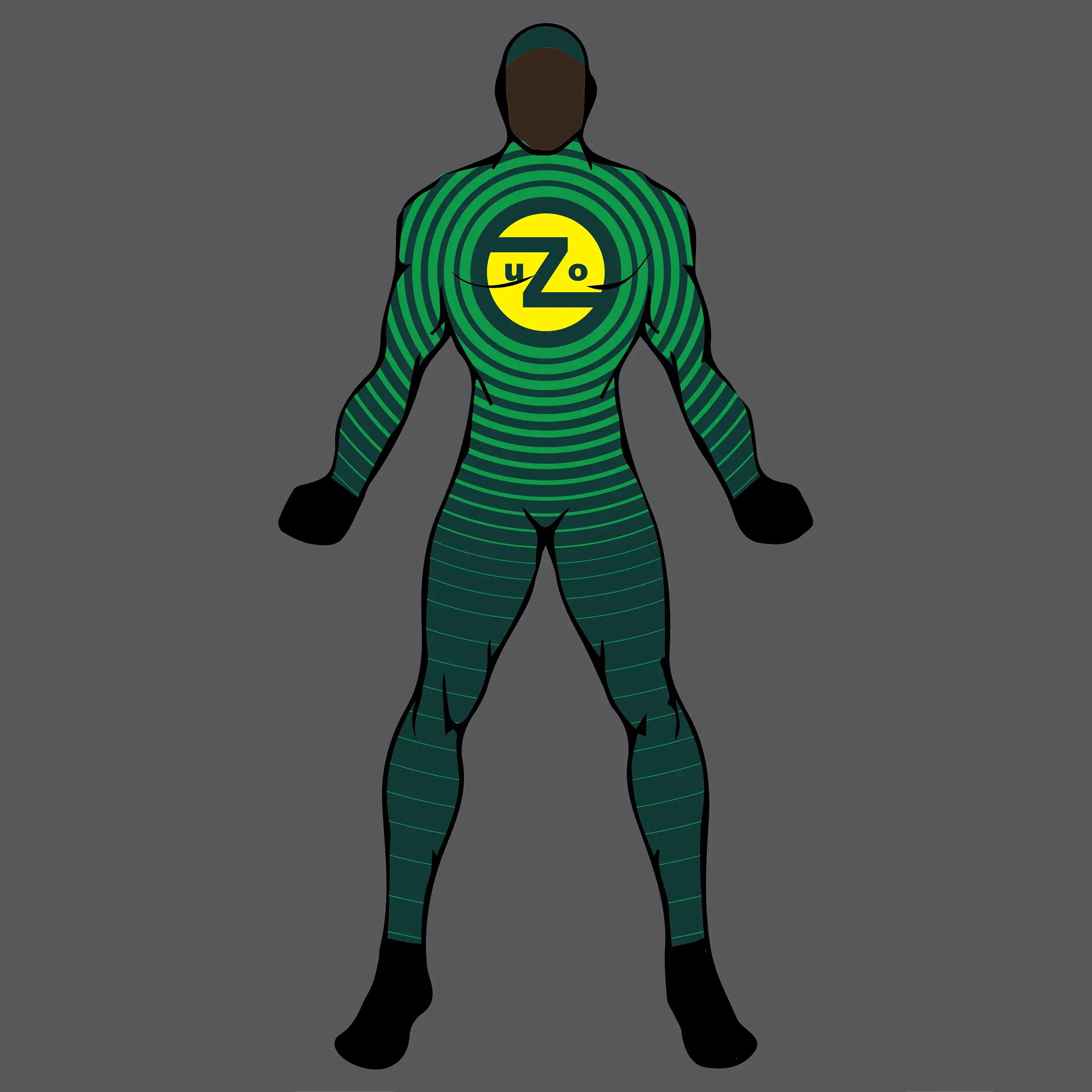 Design a branded 'super suit' for Holey Moley contestant Uzo Utti, who transforms into Super Uzo, a hero with a beat. The concentric circles represent a burst of sound from Super Uzo's chest, a beat so powerful it knocks his enemies back.